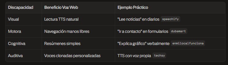 Para personas con discapacidades visuales, los asistentes convierten texto en audio natural vía TTS (Text-to-Speech), permitiendo navegar sitios complejos diciendo "lee el artículo principal" o "salta a footer". Herramientas como Speechify leen PDFs y webs enteras con entonación humana, superando lectores tradicionales en velocidad y comprensión.